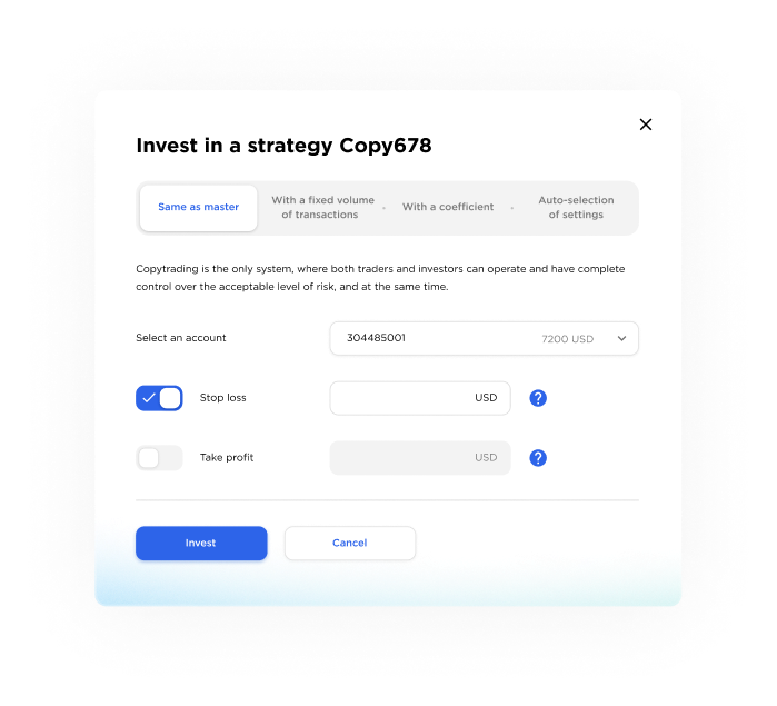 Reunimos várias opções exclusivas para personalizar a cópia de operações. Descubra a combinação perfeita das configurações que se adequam ao seu estilo de trading.